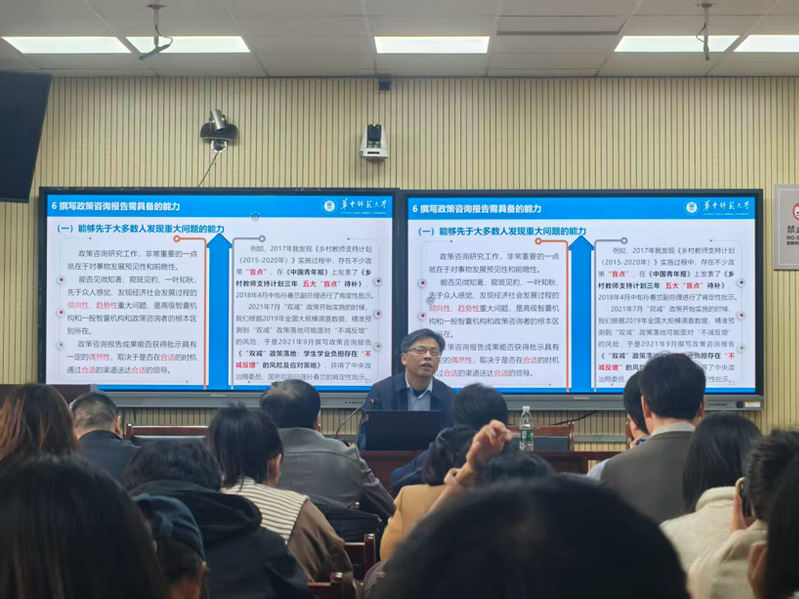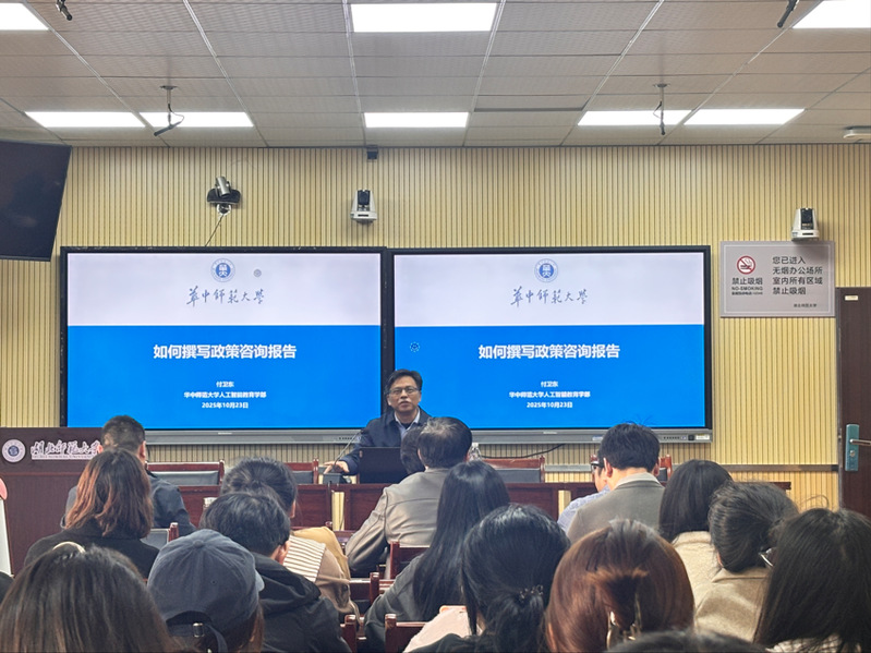 为进一步激发师生对政策咨询报告写作的浓厚兴趣、提高我院师生的政策咨询报告写作水平,10月23日下午,我院特邀华中师范大学人工智能教育学部博士生导师付卫东教授在教育大楼1316A报告厅,作了题为《如何撰写政策咨询报告》的学术讲座。讲座由崔波副院长主持,我院教师和研究生100余人参会。