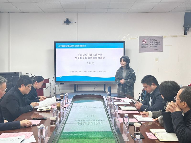 2025年11月19日,由何灿博士主持的2025年度国家社会科学基金教育学青年项目“数字化时代幼儿自主性的发展机制与教育策略研究”开题论证会在湖北师范大学教育大楼1317A顺利召开。华中师范大学教育学院涂艳国教授担任专家评议组组长,专家评议组成员有华中师范大学教育学院田友谊教授、李卉副教授、黄石市教育科学研究院程带娣教研员等,湖北师范大学科学研究发展院副院长冯伟林、教科院班子成员、课题组成员、相关专业教师和部分研究生40多人参加会议。教育科学学院副院长崔波主持活动。
