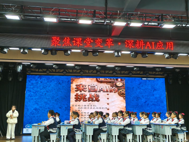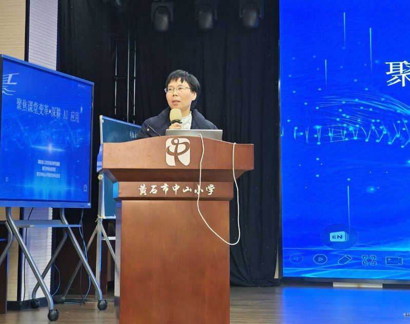 活动伊始,中山小学邓莉萍校长致辞并简要汇报了中山小学作为黄石市唯一一所教育部批准的人工智能实验基地,始终深耕AI应用探索教学新范式,并呼吁与会者要聚焦课堂变革的核心任务。随后,数学教师吴紫君以《用数对确定位置》为例进行课堂展示,生动展示了人工智能技术在激发学习兴趣、促进知识内化方面的创新实践,并真实呈现了人工智能作为第三维教学视角的存在。吴老师在课后反思中,提到了“智慧空间小博士”任务挑战、五子棋对弈、锤子捶地鼠游戏等AI情景化互动的做法非常适合教师在日常教学中进行创新。
