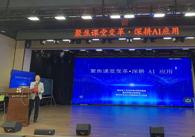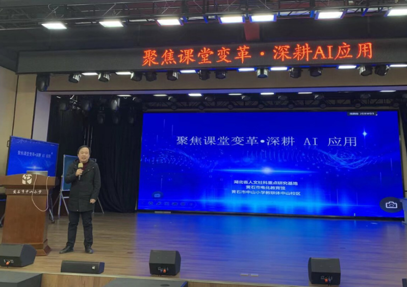 为深化人工智能与教育教学的深度融合,推动基础教育高质量发展,2025年11月20日,由基础教育高质量发展研究中心(湖北省人文社科重点研究基地)与黄石市教育信息化发展中心(黄石市电化教育馆)联合主办的“聚焦课堂变革·深耕AI应用”主题研讨会在黄石市中山小学六楼报告厅隆重举行。莅临本次会议的有全国知名专家、武汉市教育局智慧教育工作专班成员马涛主任,黄石市教育信息化发展中心朱大志主任,黄石市中山小学王志娟书记、邓莉萍校长,湖北师范大学教育科学学院邹从容教授与教育专业硕士研究生团队,以及湖北省基础教育高质量发展中心基地校骨干教师,黄石市数字化转型课题负责人。会议由黄石市中山小学彭靖校长主持。